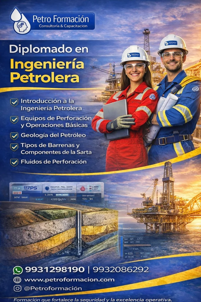 Cursos técnicos especializados en áreas como perforación, geología del petróleo, fluidos de perforación, registros geofísicos y análisis de parámetros operativos, diseñados para fortalecer las competencias del personal en campo y en operaciones energéticas.